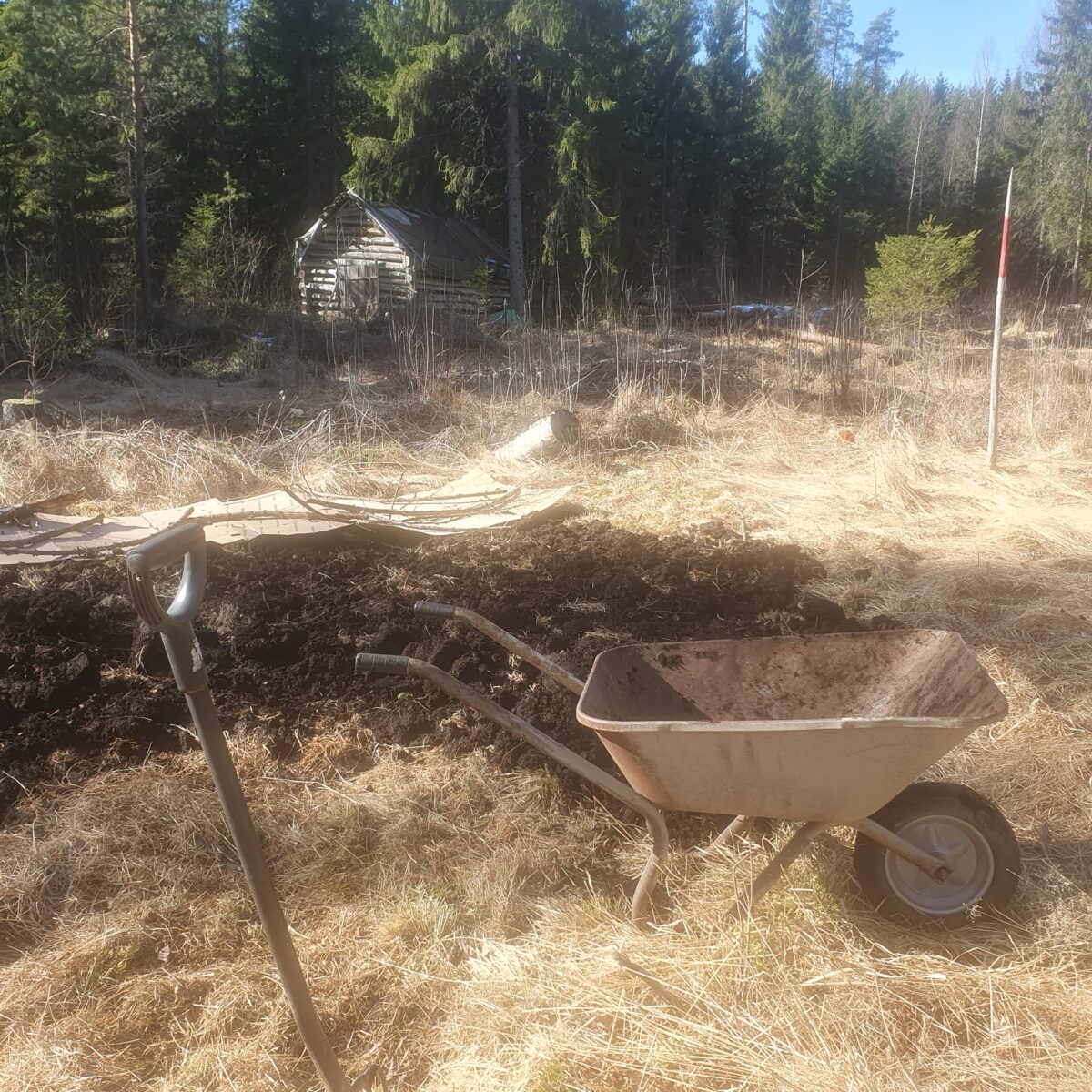 Kun isken lapiolla maahan, routaan on vain kymmenen senttiä. Maata ei ole tarkoitustakaan kääntää. Katan sen pahvein ja toukokuussa isken siihen reikiä ja sujautan kaalintaimen kuhunkin. Kun heinä jää pahvin alle, kaalten pitäisi menestyä, ja näin pitäisi syntyä kasvimaa. Jos ei kerralla niin muutamassa vuodessa.